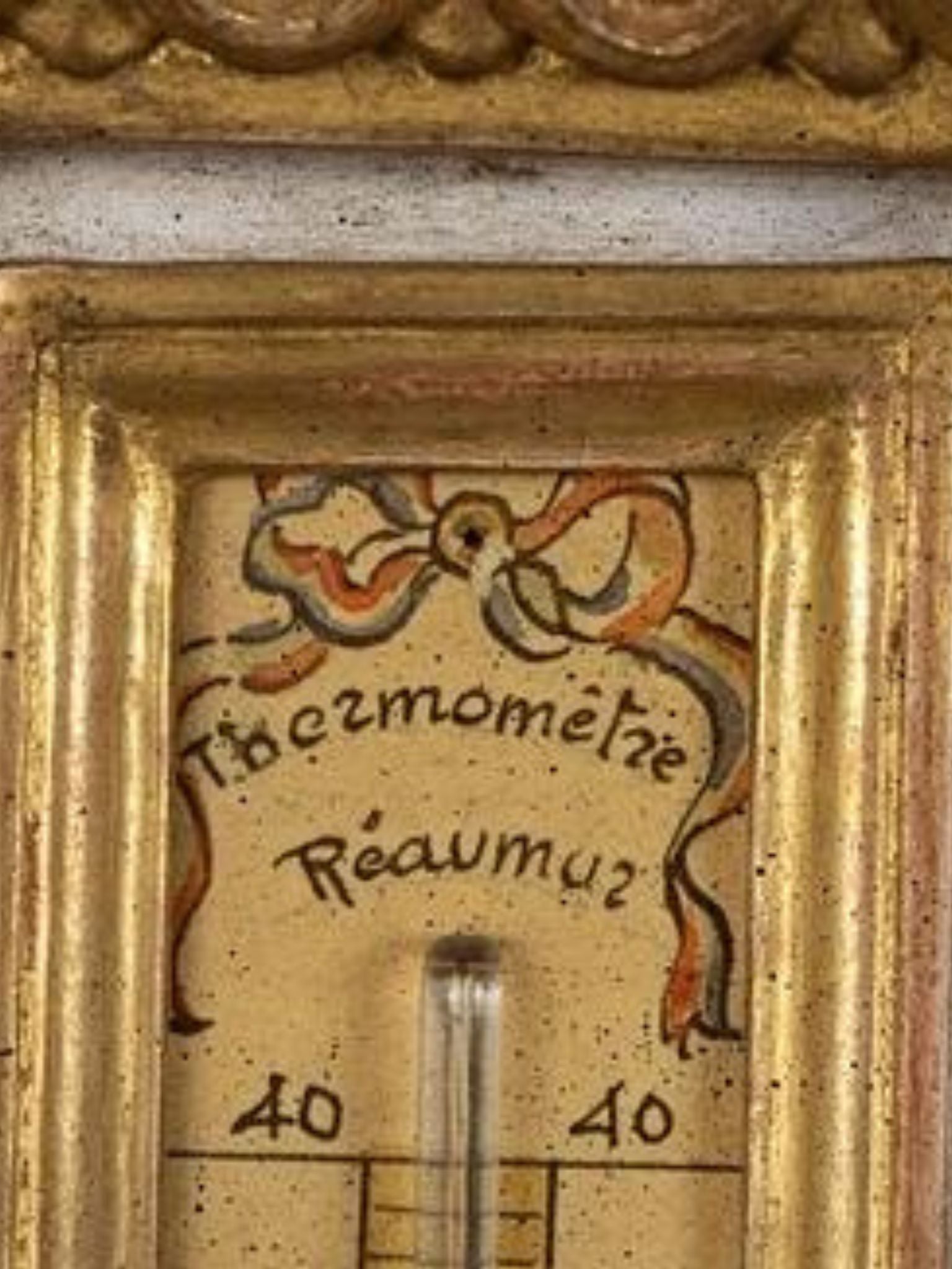 Barometer-thermometer in cream and gold laquered wood. The dial is signed Lessard Optician , Rue Saint Roch. Early 20th Century.