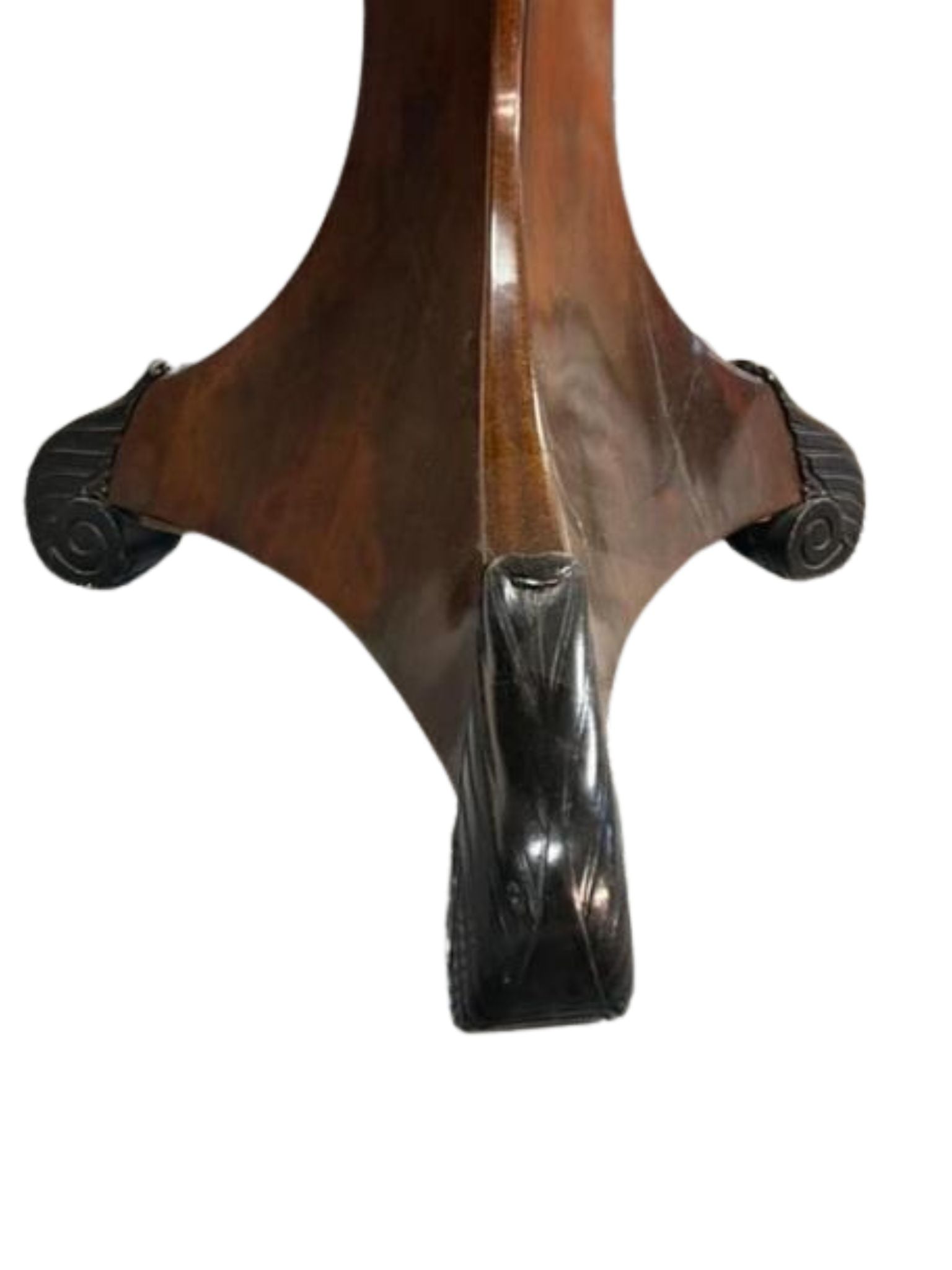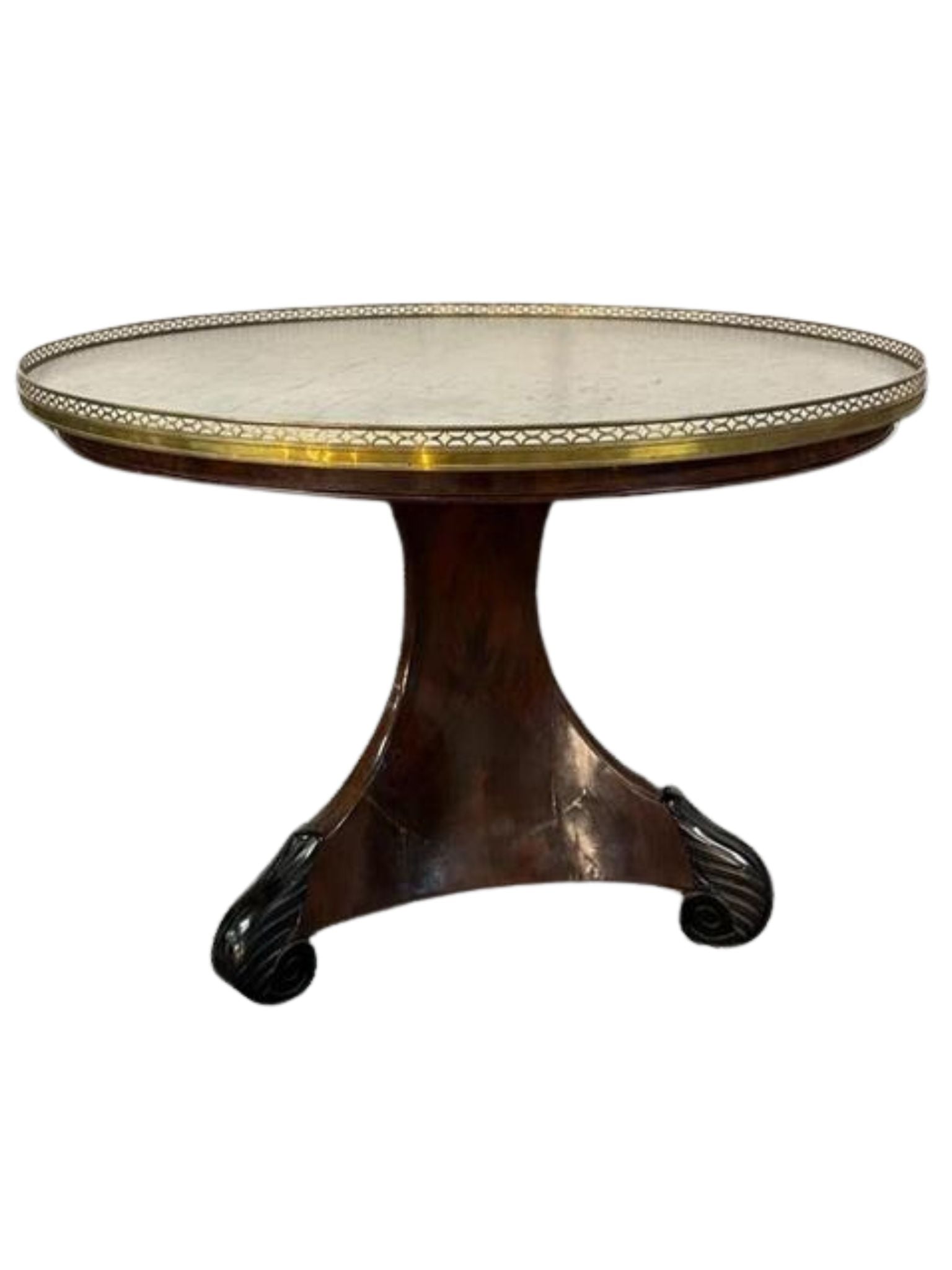 Mahogany veneered gueridon table with triangular base finished with scrolls. The top is in white marble with a decorative brass edging.