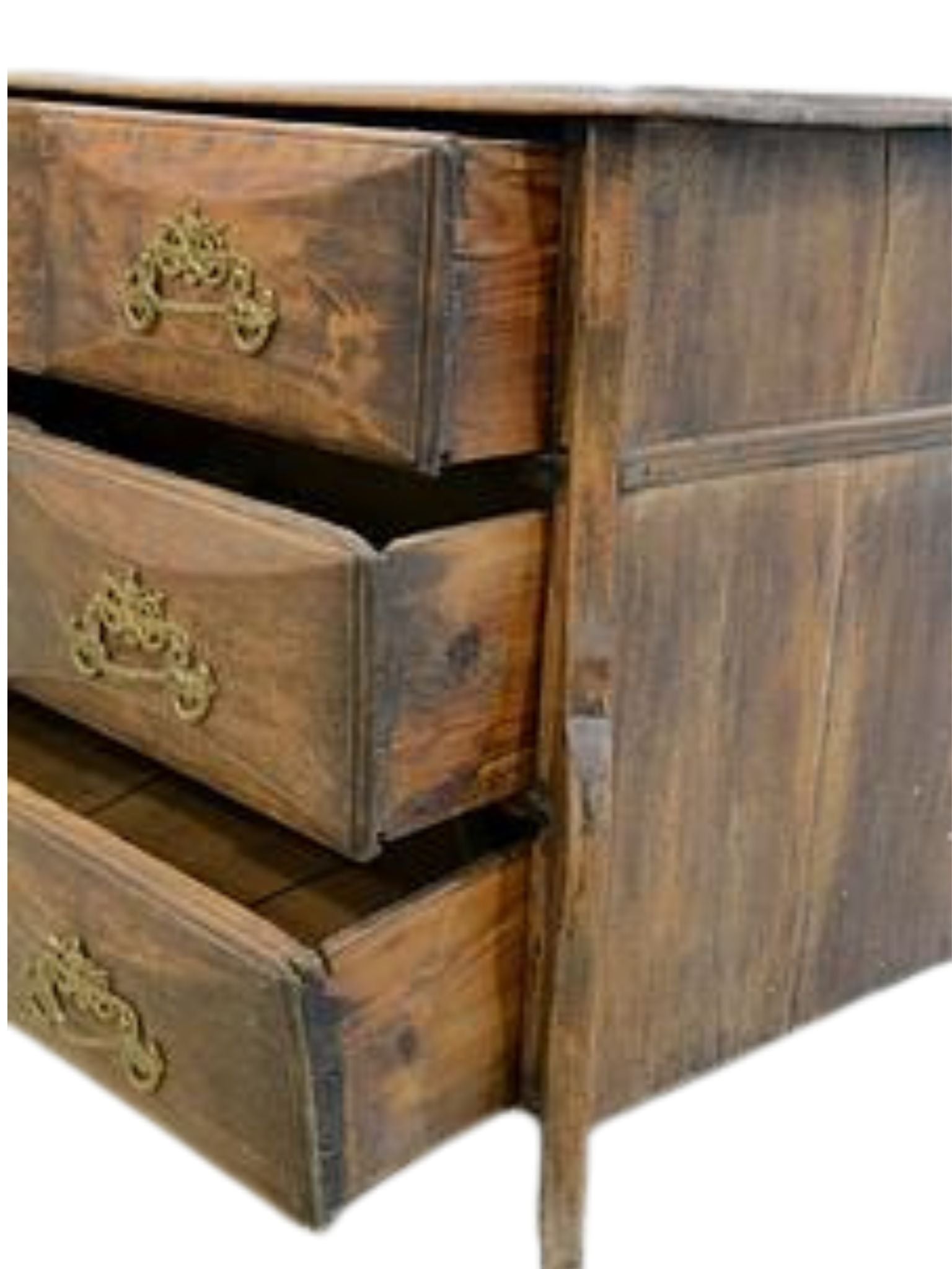 Mazarine chest of drawers in gilded and stained wood. 3 drawers ornamented with gilt bronze handles. 18th Century. H 81cm x W 128cm.