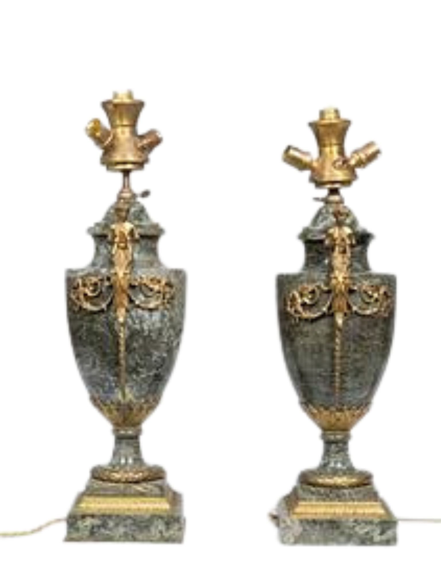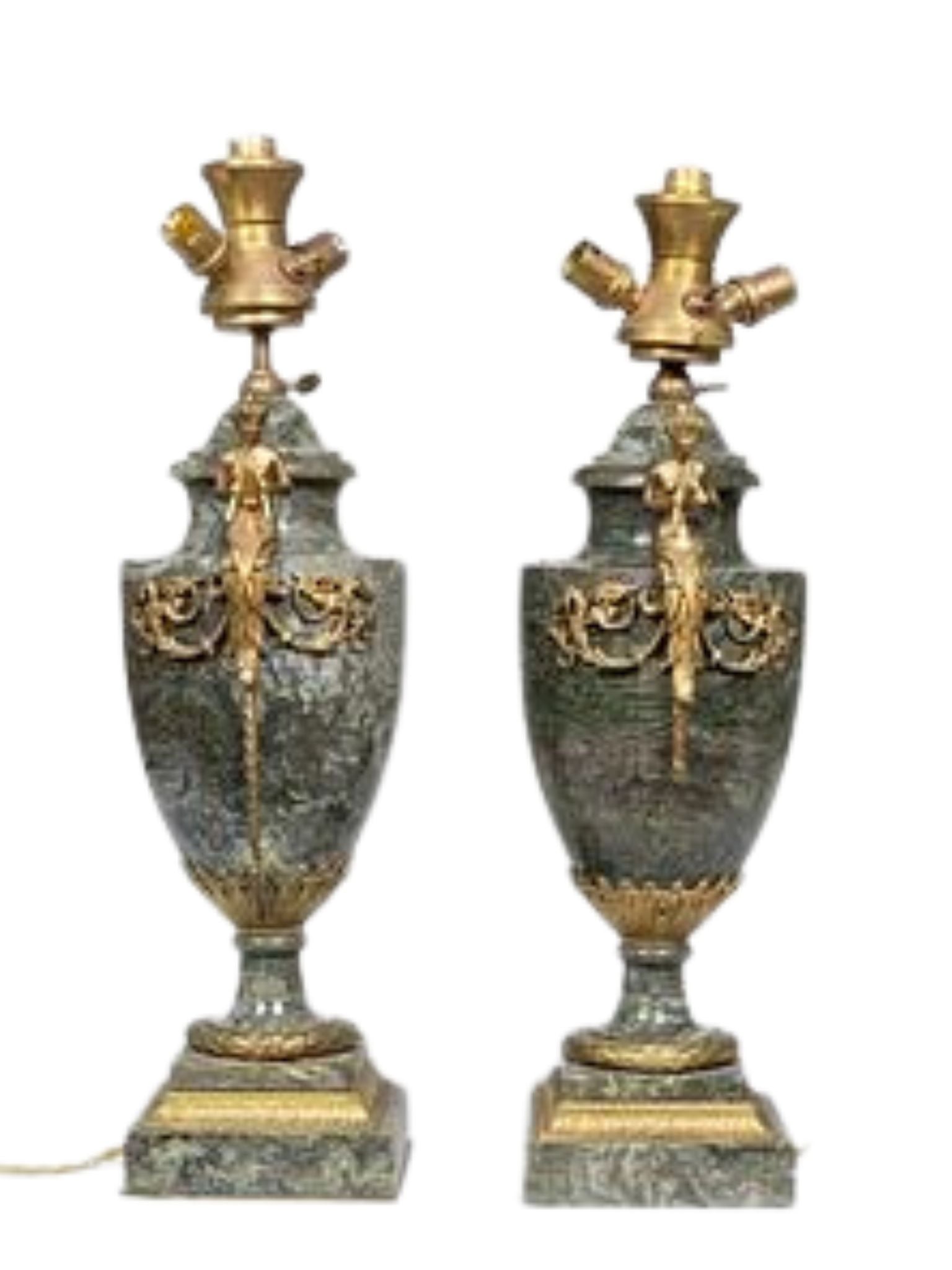 A pair of vases that have been mounted as lamps. Green marble with bronze decoration of musicians. Louis XVI. 52cm x 19cm.